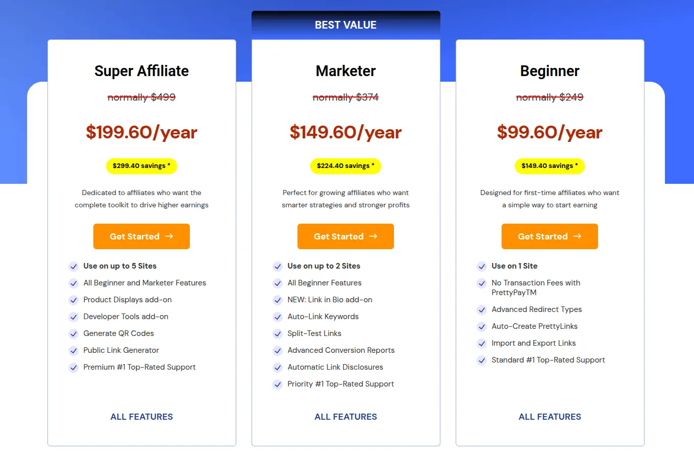 The Super Affiliate Plan sits at the top tier for $199.60 per year, slashed from the normal $499 price, saving you $299.40.